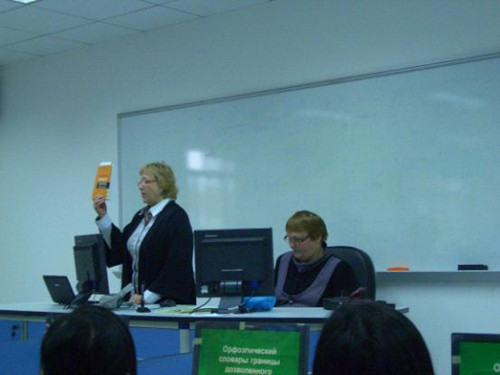 格里金娜从俄语修辞学与言语学的角度,详细地介绍了俄语词汇使用及修辞方式上的重点与难点,指出了几种常见的混用、误用现象。科诺瓦洛娃教授则从正音法的角度,介绍了俄语词汇的发音规律、重音位置特点以及语音和词汇来源的关系等。两位教授还通过现场解题与问答互动,使俄语系的学生参与其中,现场气氛十分融洽、活跃。乌拉尔联邦师范大学的几位教授对广外浪live