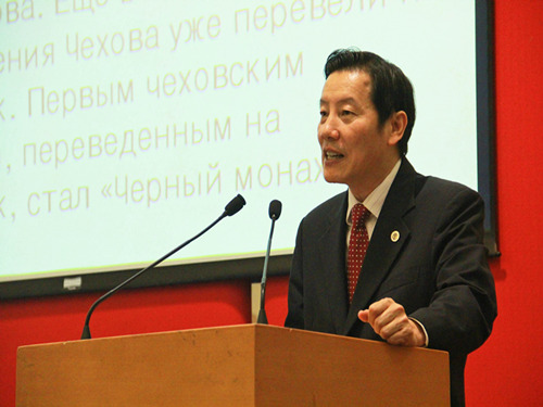 首先,米哈伊尔•维克多洛维奇•梅德韦杰夫发表讲话。他先向同学们简略的介绍了契诃夫的生平以及著作,肯定了“俄语日”活动开展的意义。他认为这样不但可以锻炼大家的俄语写作能力,还可以更深入了解俄罗斯作家以及俄罗斯人文。在最后他提出希望同学们能继续努力,坚持不懈,希望以后大家推动中俄两国的友好事业的发展。