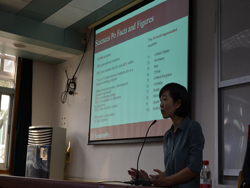 刘华胤老师首先向我们介绍了巴黎政治大学(以下简称“巴政”)的教学特点。巴政采取的是高度交叉的多学科教学,旨在培养全球化所需的复合知识型未来决策人才。巴政注重研究,目前已有12个领先的人文科学研究中心。全校40%的学生为国际学生,来自世界130多个不同国家和地区,同时巴政拥有超过350个遍布全球的合作伙伴大学:如哥伦比亚大学,哈佛大学,普林斯顿大学,伦敦政治经济学院,北京大学,清华大学,香港大学等,体现了巴政高度国际化的教学特点。