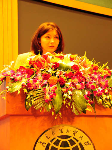 接下来由俄罗斯联邦驻广州总领事馆随员Анна-Косылева女士为本次会议致辞。她说她了解到有很多优秀的学生学习俄语,对俄语感兴趣并有深入了解俄罗斯的人也越来越多,她对这感到十分感动,并希望与中国师生保持密切联系与合作,进一步拉近两国人民的距离与交流。致辞的全过程她用流利的中文讲述,赢得了全场观众的热烈掌声。