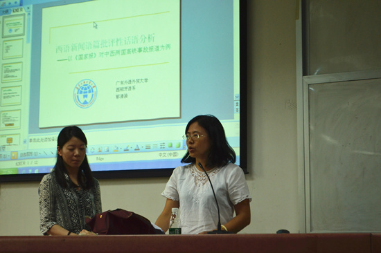 随后由来自西班牙语、俄语、法语和德语系的研究生以及两位来自俄语系的博士生现场进行论文的分析和讲解。其中,西班牙语系的研究生郁清漪以“西语新闻语篇批评性话语分析——以《国家报》对中西两国高铁事故报道为例”为题展开论述。她从选题依据和意义、研究方法和特色、研究内容及结论四个方面进行阐述。“选题选得好,论文思路清晰,表达能力强”等是各位评委老师对此论文阐述的点评。杨可老师更说到:“虽然这个选题本身不是新选题,但由西班牙语的学生用西班牙语来呈现就达到了创新的效果。”