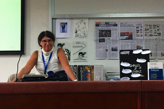 接下来,Claude Bourgeois女士又向大家介绍了中法跨文化交际的难点,也为大家的学习提出了一些建议。Claude Bourgeois女士还向法语系赠送了她珍藏的中法电影碟片和书籍。