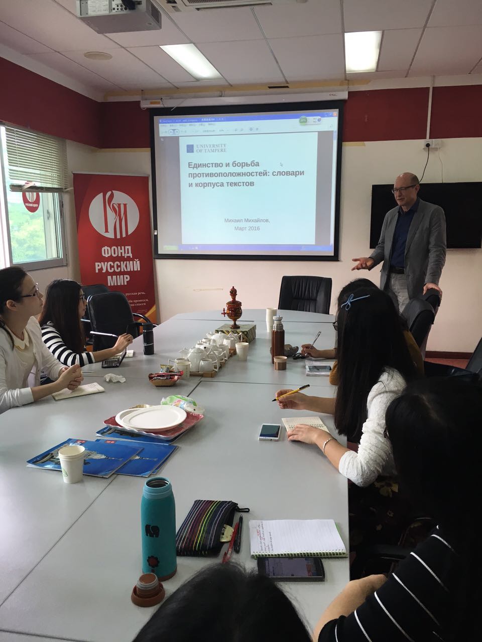 俄语中心米哈伊洛夫教授再次为俄语系老师和研究生开展了题为《对立性的统一和斗争:词典和数据库》(Единство и борьба противоположностей: словари и корпуса текстов)的讲座。在讲座上,教授给大家讲解了如何利用俄语数据库作为研究和学习俄语的资源来进一步提高和掌握俄语。教授还向大家传授了建立语料数据库的方法和经验。俄语系师生在听完讲座后都表示受益匪浅。