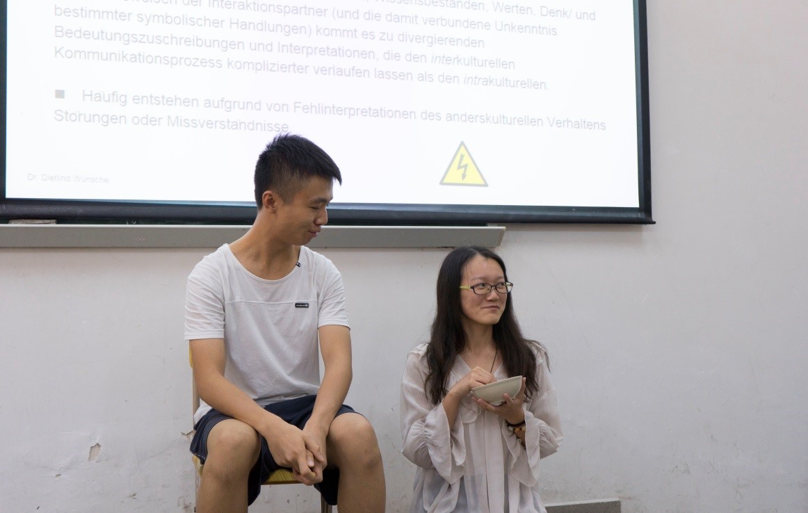 Wünsche博士的讲座主要分为两部分。一是关于跨文化交际的基本观点。先从日常生活中的交际方式入手分析,借助冰山模型来解释人们在交际中为何会产生误解;再从文化的角度来分析,先阐述了文化的含义,并列分析了直接表达型,中间型,和婉转表达型三种不同的文化特点。在这一环节中,采取了让学生协助表演的形式,让台上学生表演独特的阿尔巴特斯文化,台下学生猜想其中含义并发表想法,极大地调动了学生们的兴趣,生动地解释了文化的多样性。最后总结出跨文化交流中的几个层次。