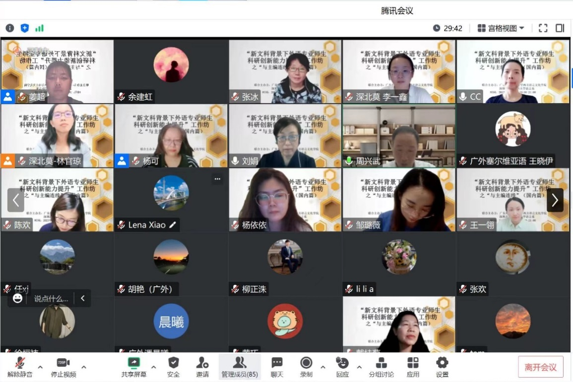 与深圳北理莫斯科大学语言系共同组织的“新文科背景下外语专业师生科研创新能力提升”工作坊之“与主编连线”活动在线上顺利举行。应邀参与此次活动的嘉宾有《俄罗斯文艺》主编刘娟教授、《中国俄语教学》副主编张冰教授、《欧亚人文研究》主编蔡晖教授、《中国斯拉夫研究》主编戴桂菊教授。连线活动由期刊介绍环节和交流环节两部分组成,第一个环节由深北莫语言系周兴武副主任主持,第二个环节由广外俄语系陈欢主任主持,广外俄语系杨可教授做了开场和总结发言。