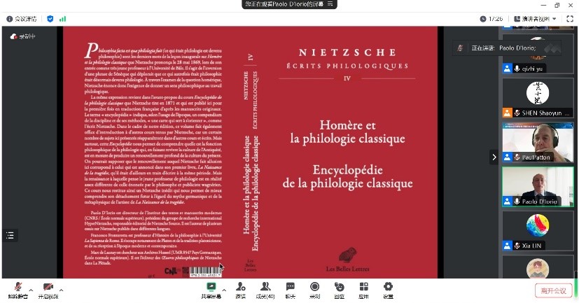 法语系举办了题为“尼采:如何改变一个时代的文化?”的线上学术讲座。此次讲座邀请了巴黎高等师范学校现代文哲文本手稿研究所所长、法国国家科研中心研究主任保罗·迪奥里奥(Paolo D’Iorio)担任主讲嘉宾,中国人民大学哲学学院李科林教授以及武汉大学哲学学院弘毅讲席教授保罗·帕顿(Paul Patton)担任评论嘉宾。法语系师生与校外听者踊跃参加,会议氛围活跃。