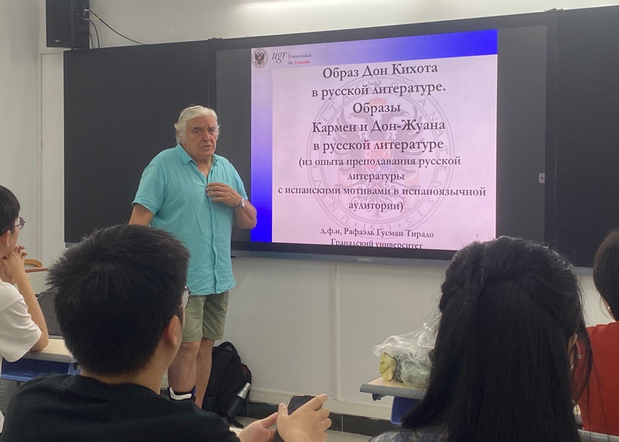 围绕翻译方法及策略、文学作品赏析、俄语语法等主题,拉斐尔·古斯曼·蒂拉多教授开设了多场讲座,包括《有关文化词汇的翻译》、《当代俄罗斯文学为何如此有趣?》、《小说<拉夫尔>中讽刺手法的运用》、《俄罗斯文学中唐·吉诃德、卡门、唐·璜的形象》和《俄语动词分类》等。