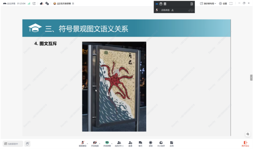 刘教授在开场环节首先阐述了符号景观图文关系研究的学术价值。她指出,深度解析符号景观中图文的组构规则与语义生成机制,不仅是解码当代视觉文化传播规律的关键路径,更是探究人类符号思维本质的重要切入点。