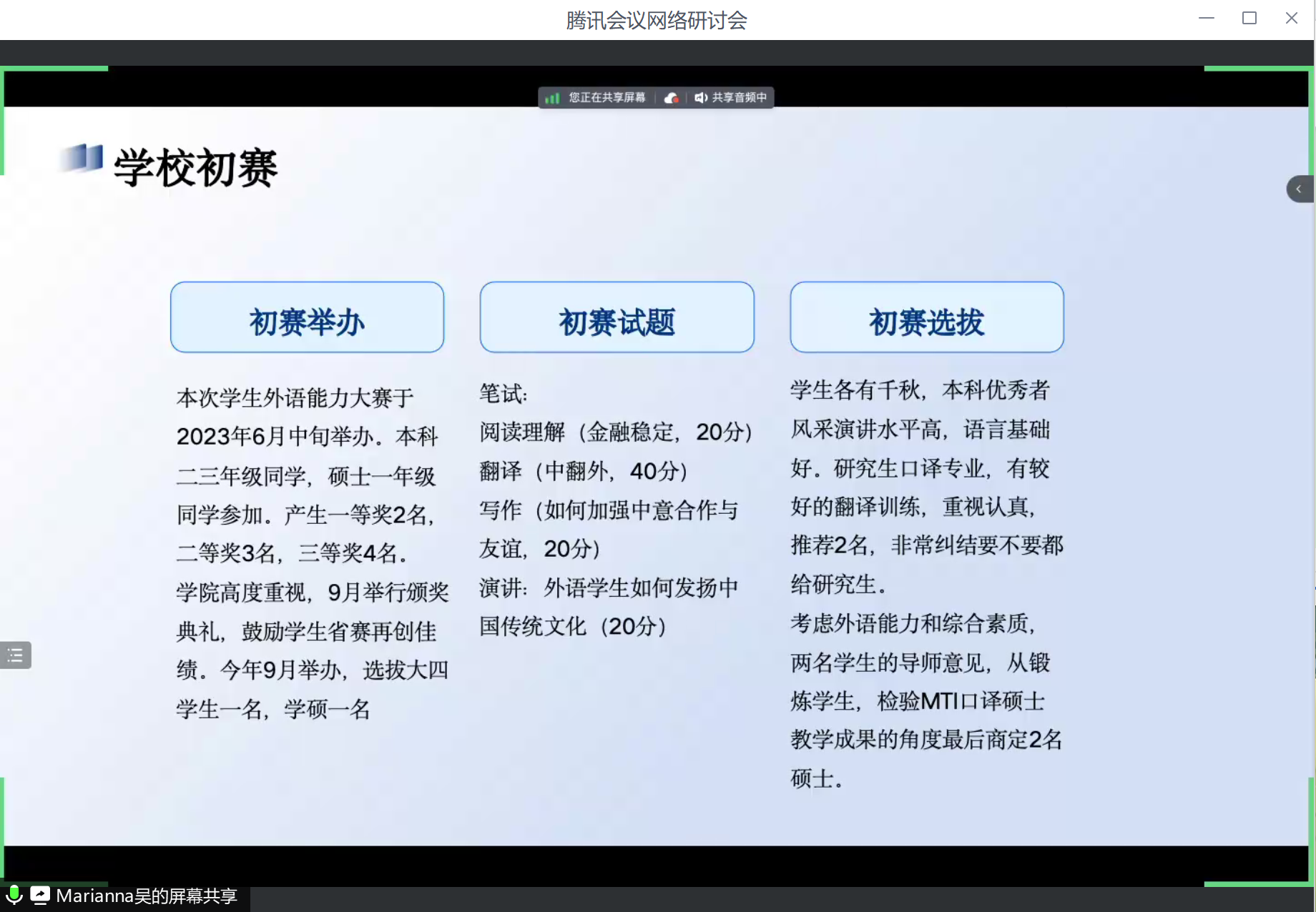 紧接着,吴菡老师展示了对外经济贸易大学校内初赛的筹备与选拔情况,参考大赛样题设计模拟试卷进行选拔,尽可能将机会平等给予各个学段的学生。另外还结合贸大特色专业课程与教学,向浪live 师生分享了三个观点:一是要在语言教学的过程中向学生传达宏观层面的知识,帮助学生提升眼界,形成自己对时代、对自身的思考与认知,找准自身定位,锚定发展目标;二是关注中国特色大国外交话语的表达,以求达到政治性、平衡性、动态性的“政治等效”;三是在具体的教学场景中要多加留意不同的文化差异下应采取不同的翻译方法。接下来,吴菡老师向我们介绍了贸大的课程培养与教学方法和成果,并通过具体案例展示了“理解当代中国”系列教材的教学方式,着重指出“口译需要大量的实践”,传道授业的过程中既需要多元化教学方法,还需要个性化学习支持。
