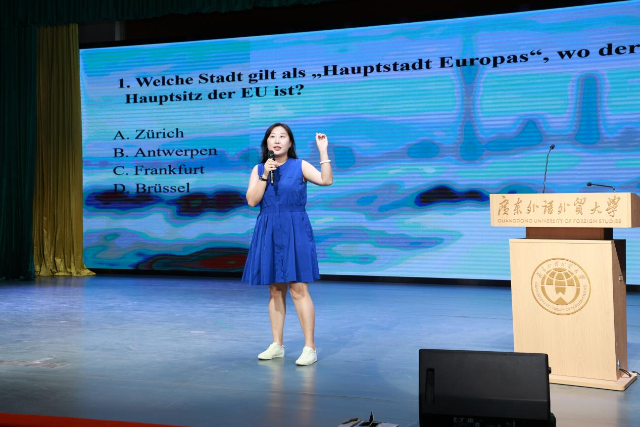 在随后的互动环节中,德语系张思源老师主持趣味问答活动。活动围绕德语国家的历史文化、民俗风情等内容展开提问,每位答对问题的同学均获得了主办方准备的精美奖品。现场学子踊跃举手、活动氛围轻松热烈,充分展现了德语系学子对跨文化知识的浓厚兴趣与积极参与的热情。
