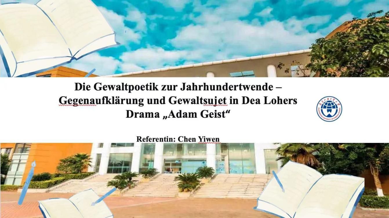 陈怡雯同学在《迪亚·洛赫尔戏剧中的暴力母题研究》中,聚焦德国当代剧作家迪亚·洛赫尔的代表作品,从戏剧结构、语言符号与舞台表现等多个维度,剖析暴力在个体与社会层面的再现方式。她主要介绍了德国当代知名女性剧作家德娅•罗尔的作品,及其作品中的暴力主题。以其1997年发表的剧作《亚当•盖斯特》(Adam Geist)为例,分析罗尔如何通过二十一个序曲的拼贴结构,呈现其对于启蒙理性的反思,以及对时代道德的警示。她的研究不仅关注暴力行为本身,更深入探讨其背后的心理机制与历史语境,揭示戏剧如何成为反思当代社会冲突的媒介。