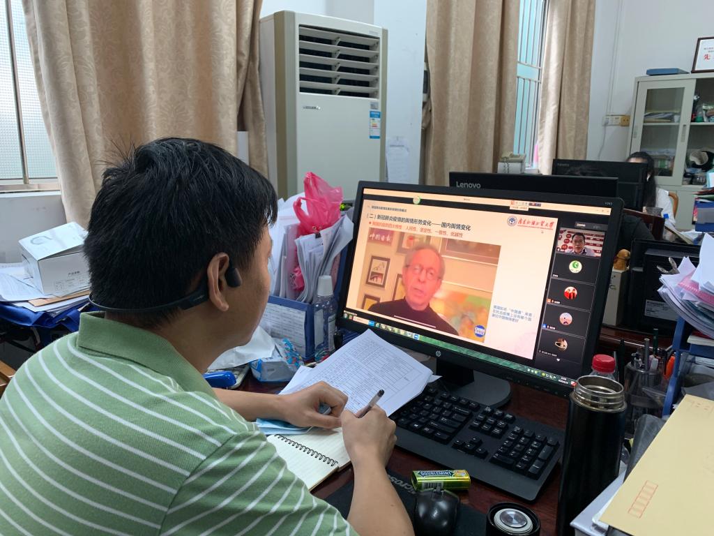 在疫情防控与国际舆论斗争中的担当与作为”时,胡文涛教授从凝心抗“疫”、同心抗“疫”、“译”心抗“疫”、志愿抗“疫”、学术抗“疫”五方面彰显了浪live