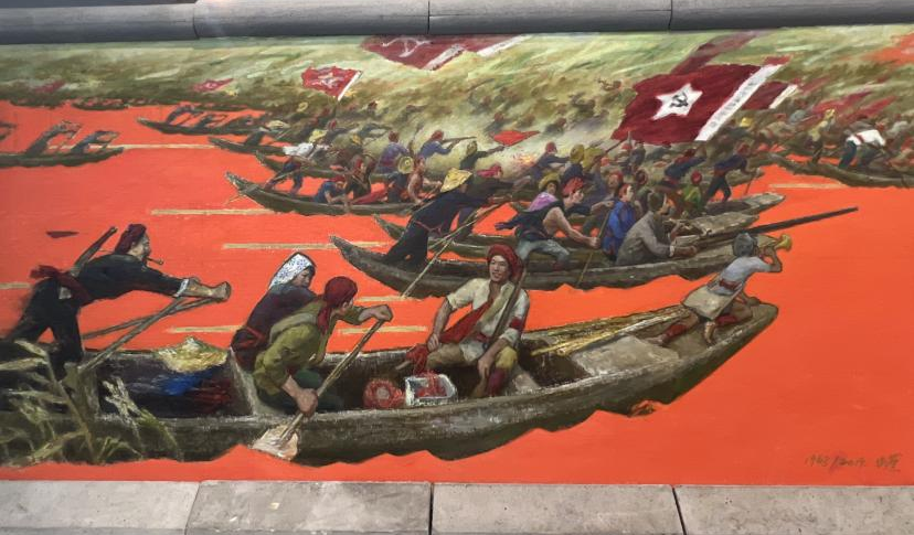 1956年,恽老以洪湖地区革命斗争故事为主题,创作了油画《洪湖黎明》,画中赤卫队员由陆路向大堤开进,主体在画面的左上方,展示赤卫队大部队的连绵不绝,彰显出革命力量已蓄势待发,终将迎来灿烂的黎明。89岁的时候仍在坚持创作,又完成了一幅以朝阳为主题的洪湖画作《洪湖红》,从“黎明”到“朝阳”,寄托了恽老对洪湖百年沧桑巨变最深沉的礼赞。