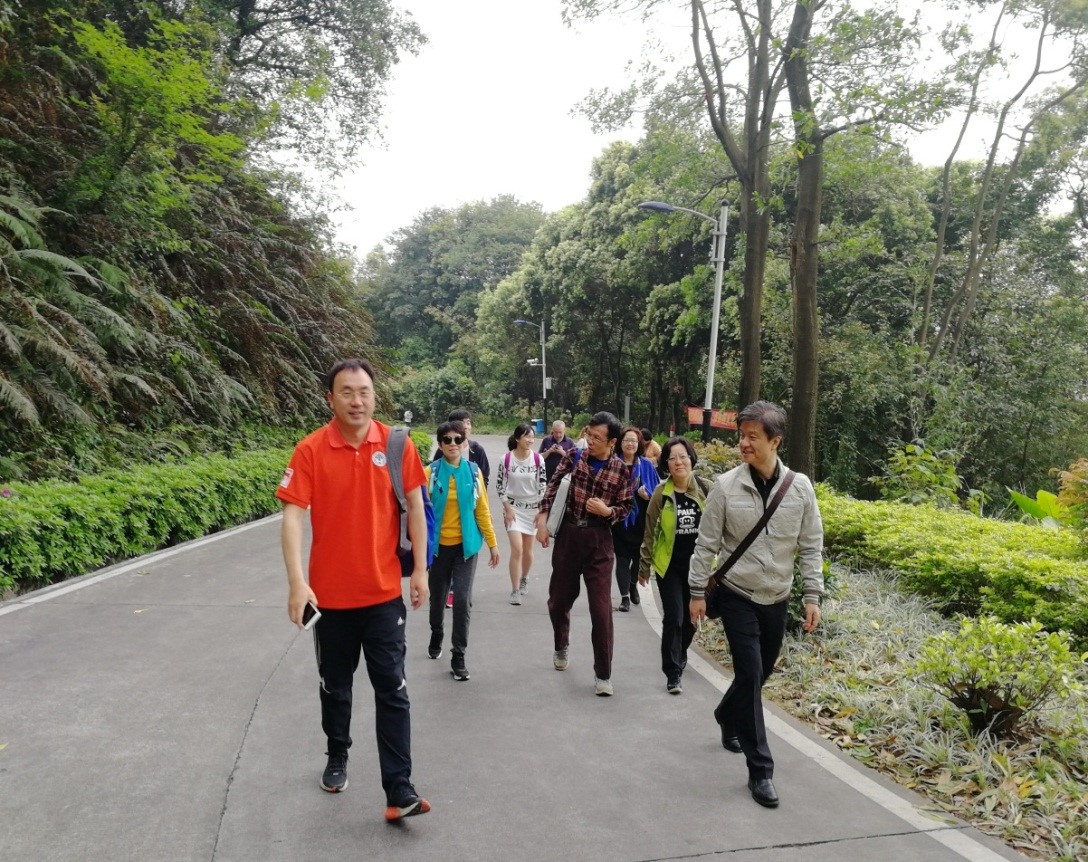 车到帽峰山后,大家纷纷健步上山。一路上,大家欢声笑语,一边兴致勃勃地聊着,一边快步向山顶前进。行走的道路十分宽阔,左右两边满是透绿的树木,中间夹杂着各色灿烂绽放的花朵,景致非常赏心悦目,让置身其中的人们暂时忘却了都市的嘈杂和喧嚣,完全沉浸在这美好的春色中。一个多小时后,大家登上了帽峰山顶,峰顶上视野开阔,清风徐来,大家顿时忘记了路途的劳累,或观望远处美丽的景色,或不停地拍照留念,或闲坐在路边小憩,交流着登山的感受,笑声不断,其乐融融。
