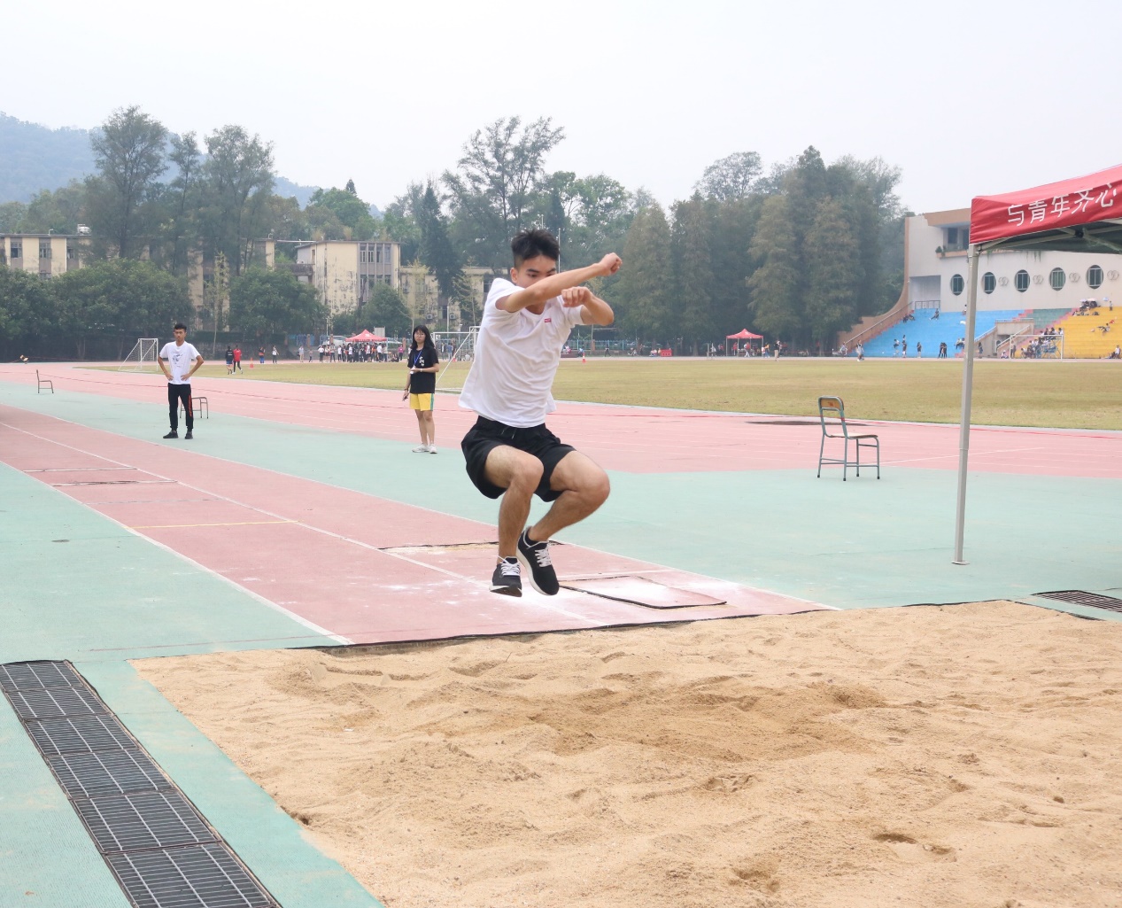 在男女子跳远的赛场上,为了能够跳出最好的成绩,大家不顾秋日的凉风,纷纷换上了短袖短裤。一番准备活动后,参赛选手们开始了激烈的角逐。助跑,起跳!动作一气合成,让两旁的观众爆发出阵阵掌声。最终葡萄牙语1701的赵钰洋以5.43m的成绩名列男子组第一,法语1701的吴纪元和西班牙语1802的吴鸿威4.55m分别荣获第二第三名。而女子组的竞争异常激烈,俄语1702的卢人琳以3.86m的成绩斩获第一,第二名俄语1702的曾镓淇和第三名法语1801的曾淑媚分别以3.60m和3.40m的成绩紧随其后。