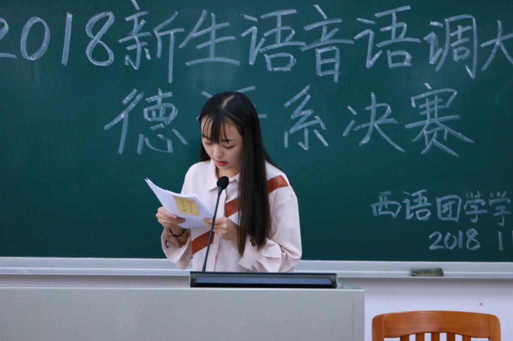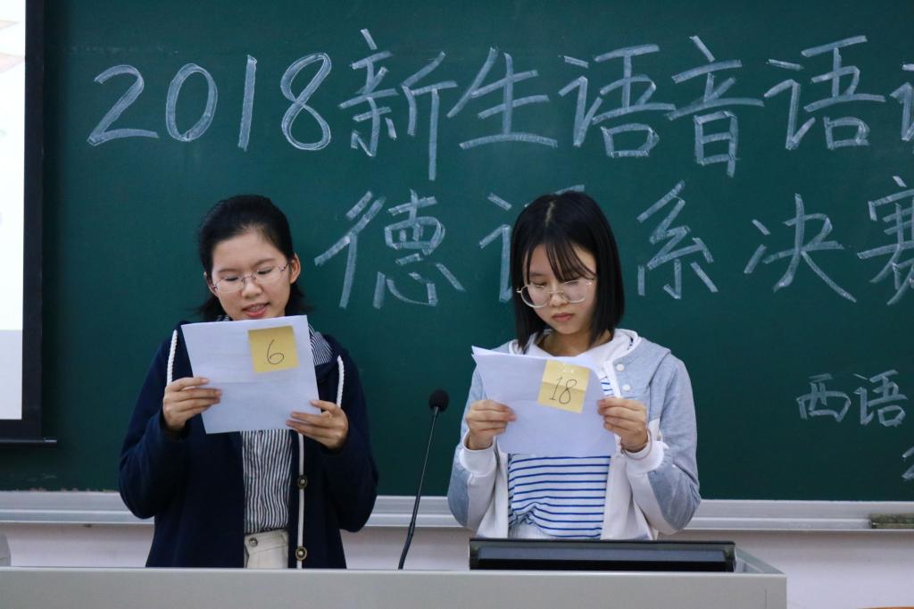 2018届德语系语音语调决赛于11月29日下午14点30分在北校六教b204举行。本次大赛由德语系大二林洁芳师姐和陆玲怡师姐进行中德双语主持。出席本次大赛的评委有德语系老师程林、贾晨、黄羽欢、林璐以及外教老师Ira。初赛中脱颖而出的26名参赛选手信心满满,准备充分,在大赛中都表现非常优秀。