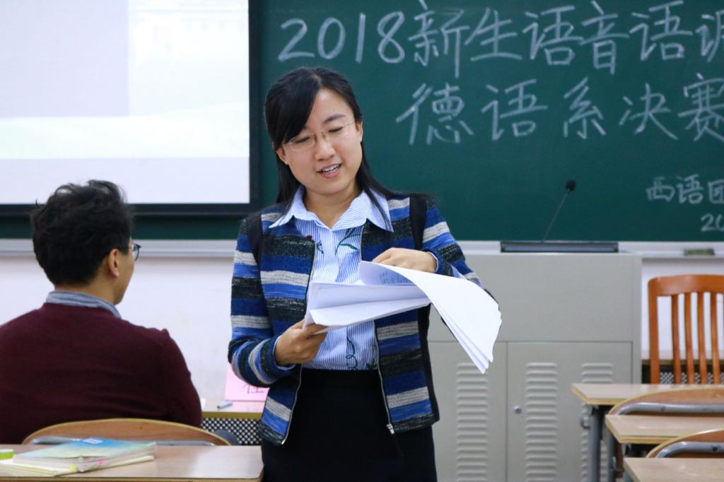 工作人员在紧张的计分时,德语系贾晨老师对选手们的表现进行了点评,她恭喜选手们在这两个月取得很大的学习成果,选手们的表现让她感到非常欣慰,她鼓励选手们接下来继续努力,取得更好的成绩。