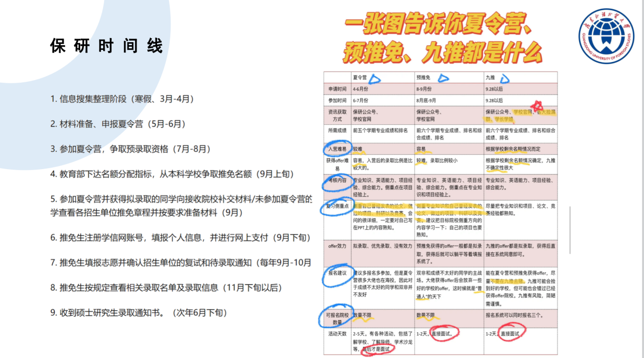 法语专业陈昊文,从保研选择的思考、保研制度介绍、如何准备和分享总结四个方面进行了细致的介绍,他指出奔着一个目标的确最有效率,但所有目标都相互关联,引导师弟师妹正确认识保研。同时,围绕保研时间线,以几所学校的报名系统和材料为例,分享如何做好提前准备,总结了关键点和难点,提供了满满的干货。
