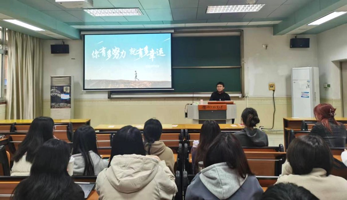 在四教424开展学生职业规划经验分享会,2020级法语系尹世源同学向2021级师弟师妹进行职业规划经验分享。分享会由21级辅导员冯迪南主持。
