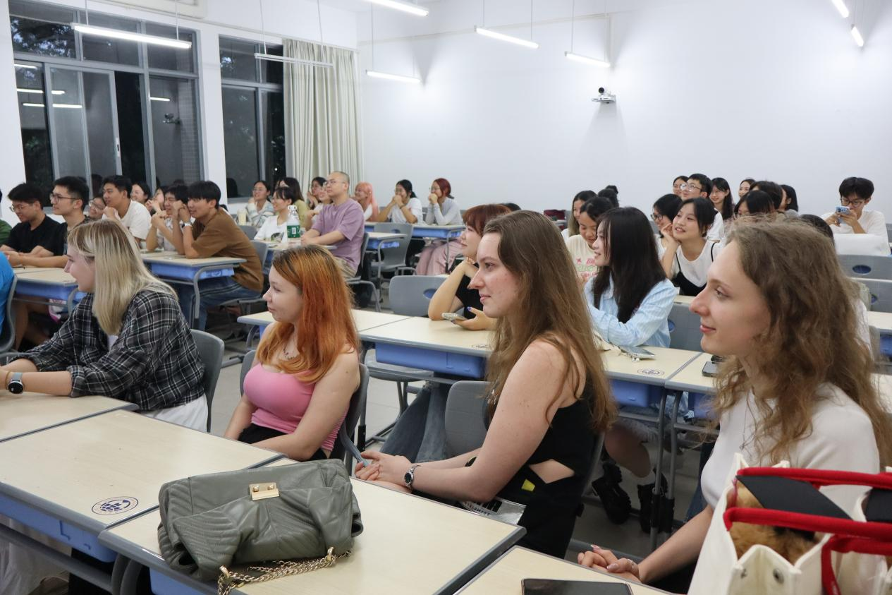 俄语系联合广外全球学生交流大使团在白云山校区一教南楼307室举办了与莫斯科国立语言大学的校际学生交流见面会。俄语系主任陈欢老师、姜超老师、梁玮琦老师,以及外教沙拉夫特季诺夫·扎力到场交流,俄语专业40余名学生踊跃参与,现场气氛热烈,交流互动频繁。