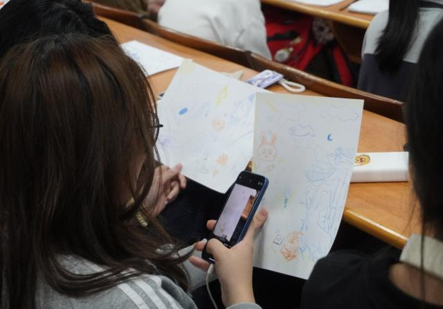 在冥想聚焦内心状态环节中,付蒙带领同学们通过冥想来感知自己的身体和内心的状态,从而在冥想中开始和自己的潜意识进行连接。冥想结束后,通过绘画接龙和看图故事接龙的方式,带领同学们感受游戏的趣味性和体验艺术创作。在游戏进行的过程中,同学们或专注于手中的画笔,在空白的画纸上尽情挥洒着自己的创意,或认真倾听着他人创作的故事,或积极地站在台前分享着自己创作的故事。活动氛围轻松和谐,大家时不时被诙谐而又有趣的故事所感染,一起发出快活的欢笑声。