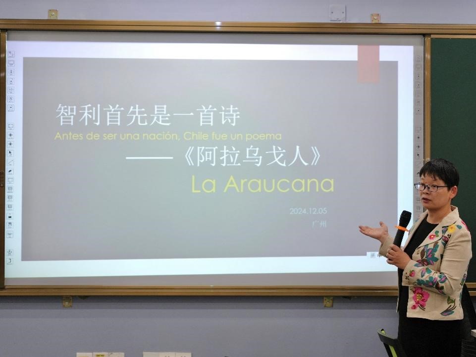 12月5日晚上19:30,商务印书馆副编审崔燕老师在一教南楼207举办了题为“智利首先是一首诗——《阿拉乌戈人》赏析”的讲座,并与我系师生进行了深入的探讨与交流。