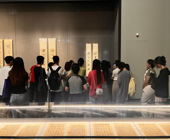 在博物院讲解员的带领下,师生们一起参观了“泛彼无垠——广州艺术博物院藏历代书法精品展”,本次展览以“唐人写经”“明代书法”“清代书法”“近现代书法”四个单元呈现,展出作品创作年代跨度长,形式多样,篆、隶、草、楷、行五体俱全,文辞内容丰富,涉及佛教经典、诗文词赋、文房楹联、往来书信、书评画论等内容。历代众多名家书法佳作齐聚一堂,展览作品风格各异,从豪迈古韵到自然出新,无不展现了中国书法艺术的博大精深和独特魅力,师生们在参观中也更加坚定了文化自信。