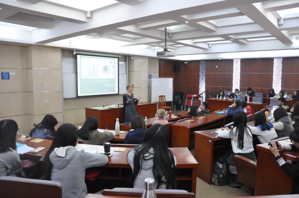 为波兰语系师生开讲座。出席本次讲座的老师有波兰语系系主任茅银辉老师,外教阿格涅什卡·雅辛斯卡(Agnieszka Jasińska)以及青年教师张和轩。在讲座上,克里斯汀娜女士向大家介绍了波兰诗歌在形式和题材上的发展历程以及目前诗歌在波兰的发展状况。