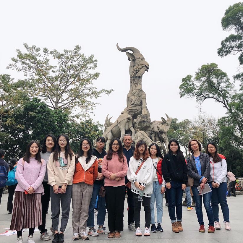 1月13日上午,同学们首先参观了羊城八景之一的越秀公园(YuexiuPark)。越秀公园是广州最早的公园之一,也是广州规模最大的综合性公园。在简单介绍越秀公园的历史概况后,同学们以镇海楼(BudynekZhenhai) - 中山纪念碑(Monument Sun Yat-sena) - 五羊雕塑(PomnikPięciuKóz)为主线,在寒冬中仍绿意盎然的越秀公园中穿梭,沙沙簌簌的波兰语在微风中格外动人。路途中,同学们还就明代古城墙(Mur dynastii Ming)作了介绍。