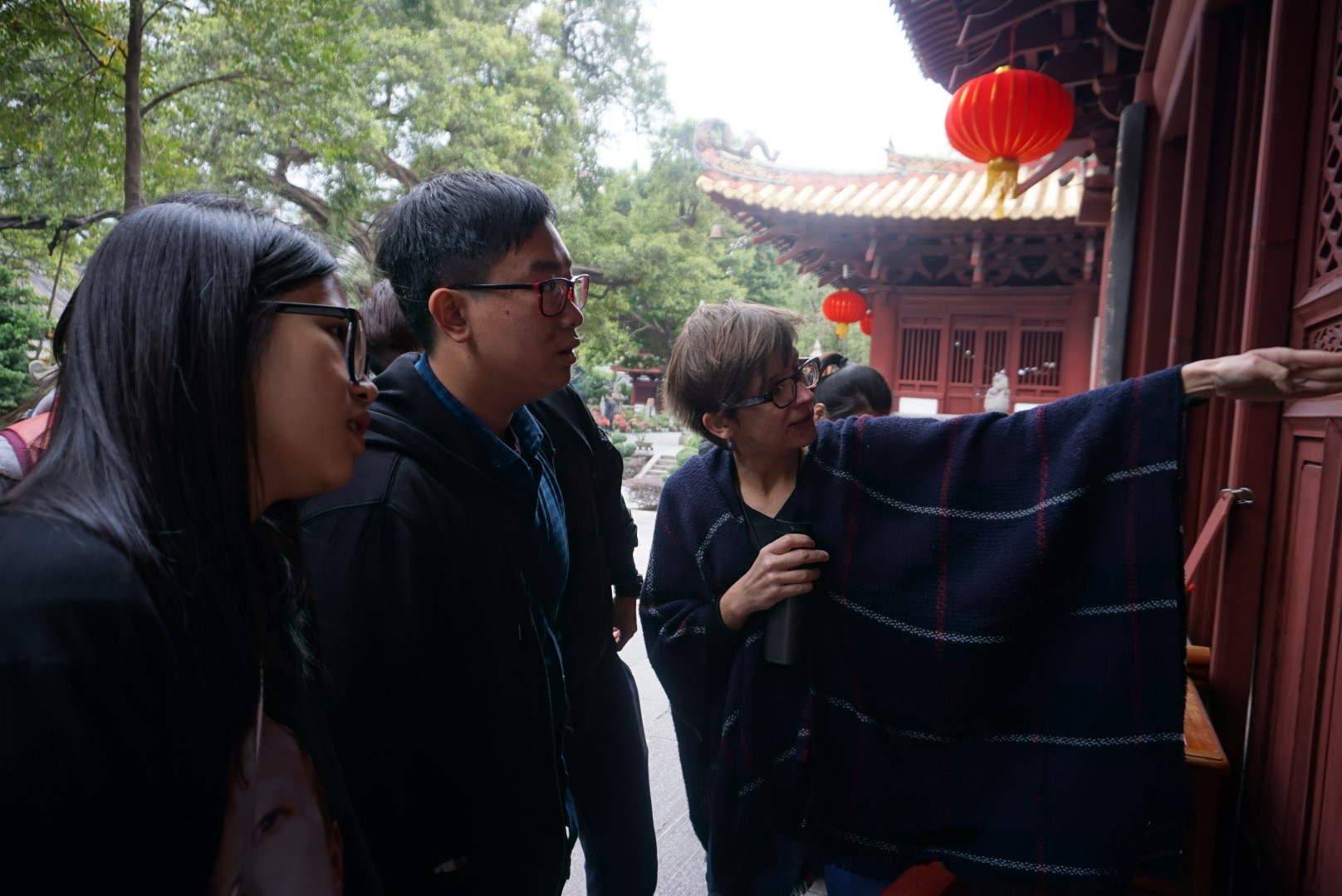 进入光孝寺后,同学们首先介绍了光孝寺的发展历史及相关人物的生平。紧接着,第二座门楼里的四大天王(Czterech Nebiańskich Królów)又掀起了一场即兴口译。我们参观介绍了光孝寺的主殿——大雄宝殿(PawilonWielkiegoZwycięzcy),以及偏殿建筑,如:钟鼓楼、六祖殿、泰佛殿、洗钵泉、柯子树等。僧侣给我们每人派了一炷香(kadzidła),我们带着外教体验了一次别具地域特色的上香拜佛的简单仪式。从佛(Budda)到菩萨(Bodhisattwa),从建筑结构到历史典故,同学们翻译的内容包罗万象。博学好问的外教激发起同学们一场又一场激烈的讨论,大家从中掌握了不少翻译技巧及佛教知识。