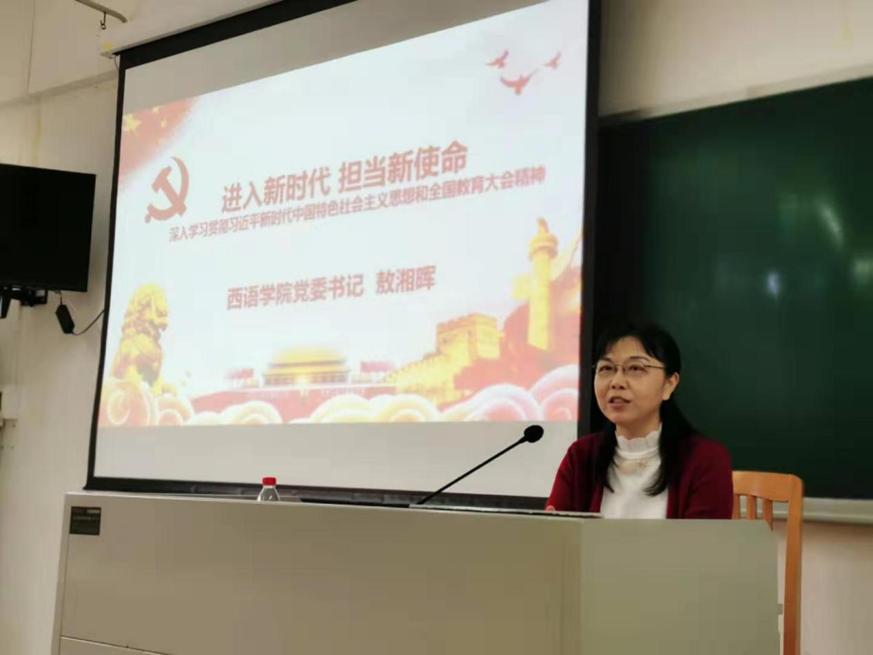 敖湘晖作了题为《进入新时代,担当新使命——深入学习贯彻习近平新时代中国特色社会主义思想和全国教育大会精神》的授课,结合学院学生专业特点,重点讲授习近平新时代中国特色社会主义思想,习近平总书记在全国教育大会上的重要讲话精神。授课内容分为“怎样理解中国特色社会主义‘进入新时代’;新时代的新使命、新思想、新方略和新征程;做新时代的建设者和接班人”等三个部分。