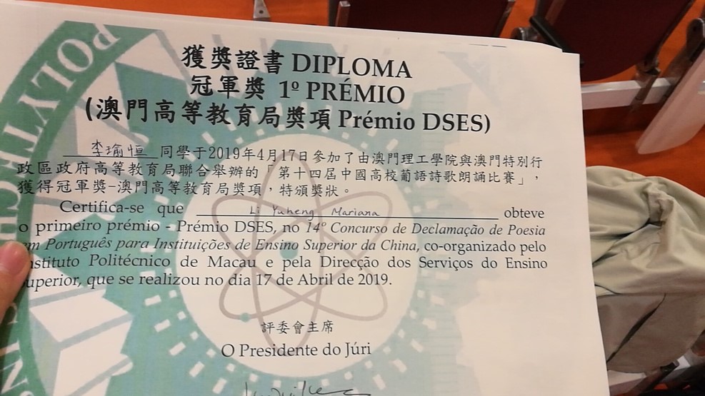 葡萄牙语系再创佳绩,2015级学生李瑜恒获高级组冠军、2017级学生陈隆获中级组亚军。