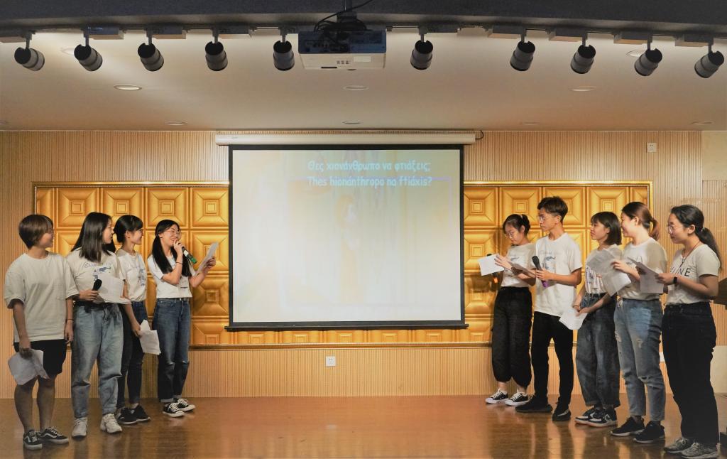大二同学们热情洋溢地演唱了三首希腊歌曲,《Θες χιονάνθρωπο να φτιάξεις》、《Πόσο μακριά θα πάω》以及《Ας κρατήσουν οι χοροί》,歌声欢快动听、悠扬婉转,展示了同学们杰出的希腊语水平。