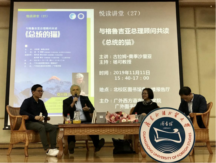 院长杨可教授和其博士生周兴武、“云山青年学者”黄天德博士合作翻译并出版。11月11日下午,学校有幸邀请到了古拉姆·奥季沙里亚先生本人在图书馆报告厅带大家共读《总统的猫》,并走进格鲁吉亚这一神秘的国度。