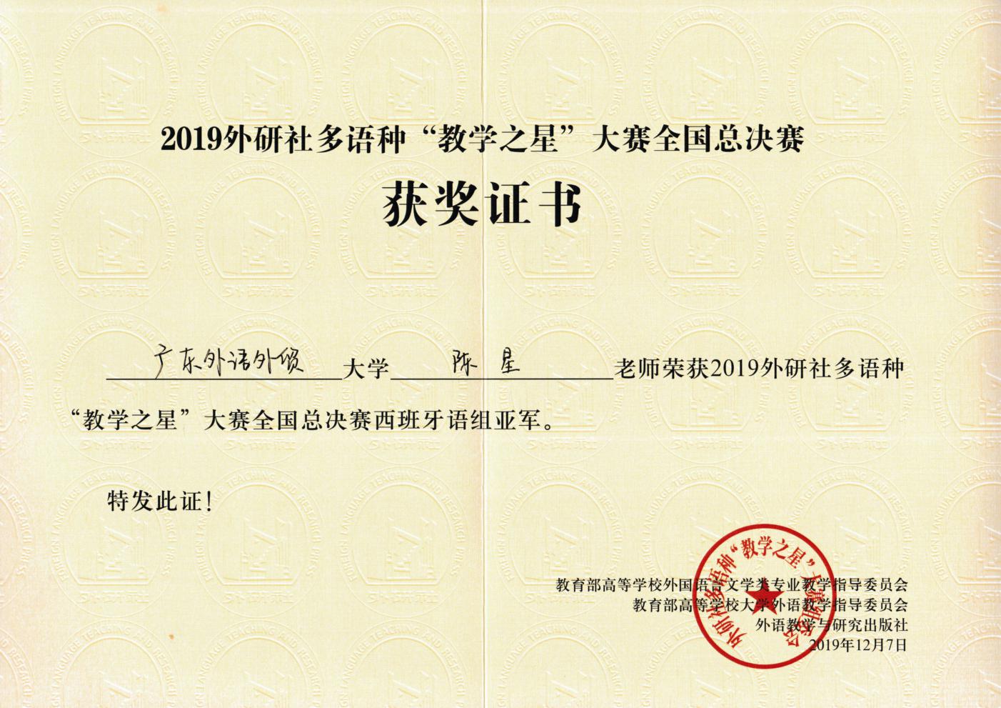 教师陈星获得西班牙语组的亚军。该比赛是面向高校多语种教师开展的一项规模最大、语种最多的全国性多语种品牌赛事。