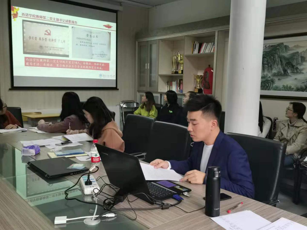 会议第一项议程为教工第二党支部书记费俊慧就“双带头人”党支部书记工作室的党建工作进行总结报告。随后各支部按照教工第一党支部、教工第三党支部、法语本科学生党支部、德语本科学生党支部、俄语本科学生党支部、西语本科学生党支部、非通用语本科学生联合党支部、德西研究生联合党支部、法俄研究生联合党支部的顺序依次进行述职。