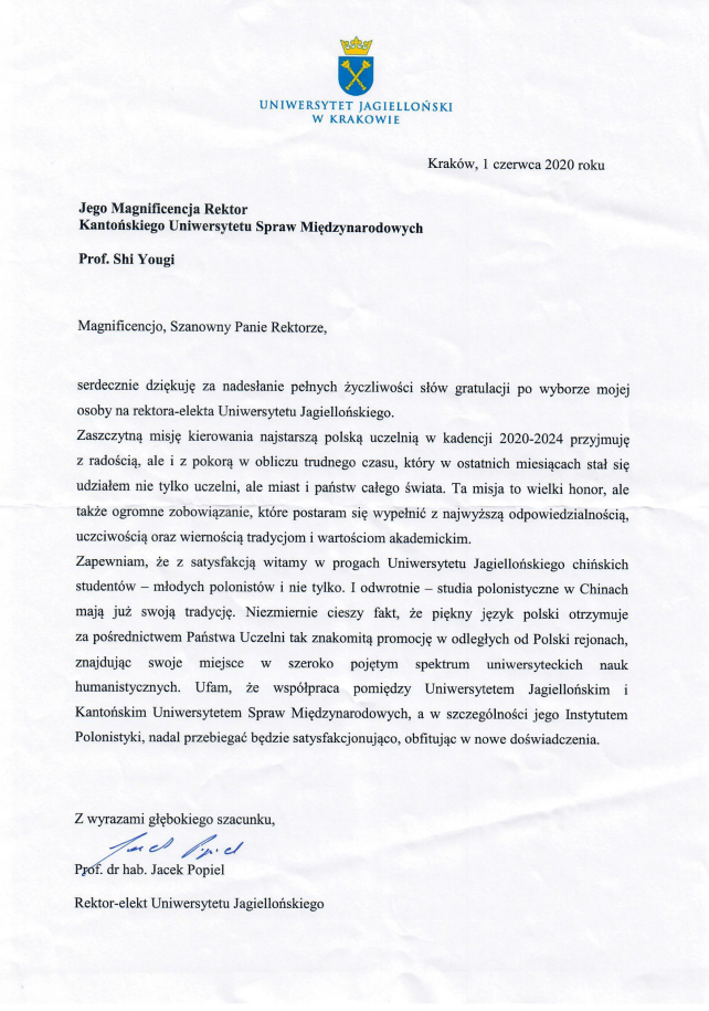 诚挚祝贺,并表示他将继续发扬雅大深厚的学术传统与价值,肩负起管理大学的光荣使命。雅大校长在信中赞扬广外在中国推广与发展波兰语学术研究所做出的努力,肯定了两校多年合作成果,热情欢迎广外学生前往雅盖隆大学进行学习与交流。