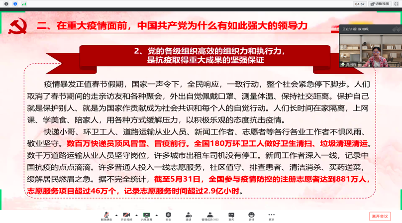 敖湘晖书记以“中国共产党在抗击疫情斗争中的强大领导力”为题,从中国抗击疫情的艰辛历程出发,指出在重大疫情面前,党中央领导集体英明的领导力,是抗疫取得重大成果的定海神针,党的各级组织高效的组织力和执行力,是抗疫取得重大成果的坚强保证,广大共产党员和党员干部的先锋模范力,是抗疫取得重大成果的中坚力量,引导广大青年学子不忘初心、牢记使命、志存高远、脚踏实地。