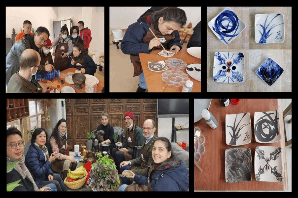 在陶瓷工作室,外籍教师在艺术学院的老师的介绍下,了解了中华陶瓷文化的悠久历史,初步认识了青花等颜料,对烧制瓷器的流程也有了初步了解。他们选择了传统花卉图案,认认真真画在半成品的盘子上;还饶有兴趣上手拉坯,亲自实践,制作了陶碗陶杯。