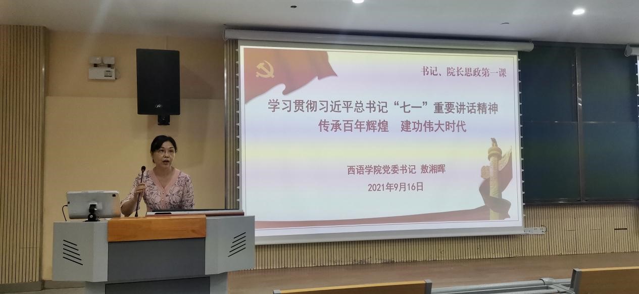 在一教109举行书记、院长“思政第一课”。学院党委书记敖湘晖、院长杨可、研究生辅导员张阳和2021级研究生新生们共计106人参加“思政第一课”学习。