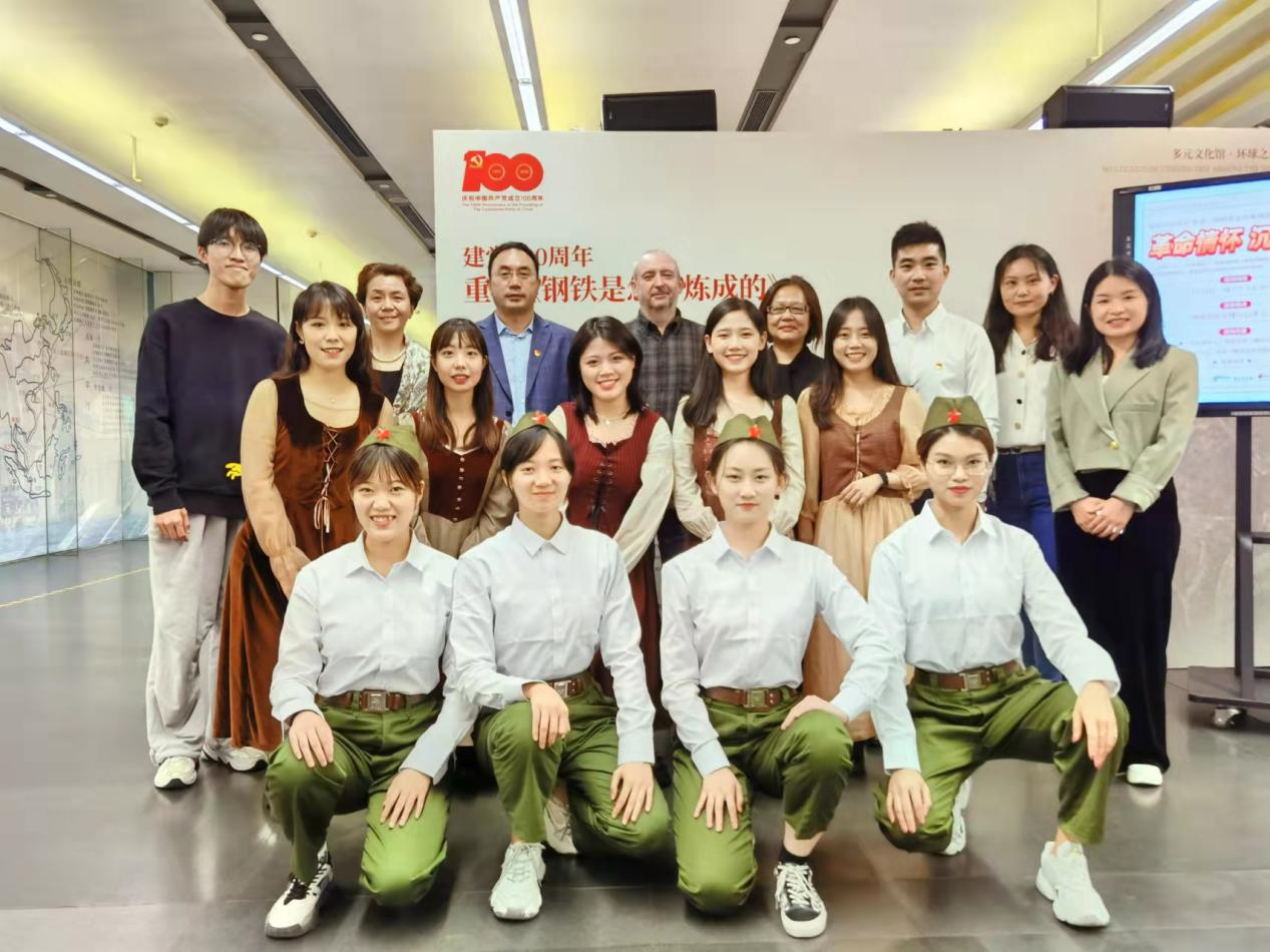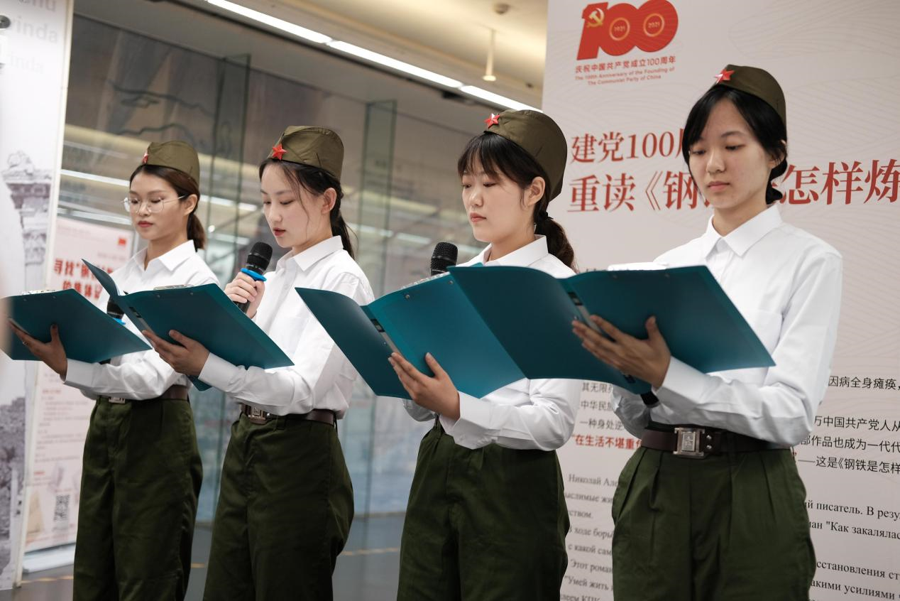 在活动上,首先由俄语系费俊慧老师和研究生温圣选共同担任“红色领读人”,为公众开展双语导赏,重温经典背后的革命精神。接着,21级俄语口译硕士班同学现场献唱苏联经典歌曲《红莓花儿开》,并朗诵《钢铁是怎样炼成的》原著经典选段,为读者营造立体沉浸式的观展体验。