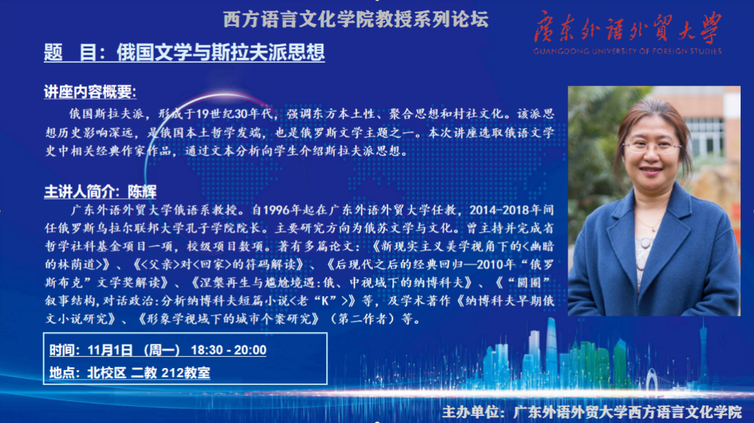 俄语系陈辉教授带来的《俄国文学与斯拉夫派思想》。讲座由研究生办公室主任臧宇老师主持,浪live