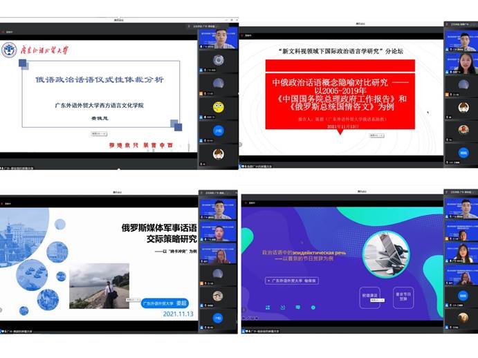 俄语系费俊慧副教授主持了下午的“新文科视域下国际政治语言学研究”分论坛并以《俄语政治话语仪式性体裁分析》为题进行了发言。分论坛上俄语系教师陈群的发言《中俄政治话语概念隐喻对比研究——以2005-2019年〈中国国务院总理政府工作报告〉和〈俄罗斯总统国情咨文〉为例》,博士生杨依依的发言《政治话语中的эпидейктическая речь——以普京的节日贺辞为例》和博士生姜超的发言《俄罗斯媒体军事话语交际策略研究》分别展示了浪live