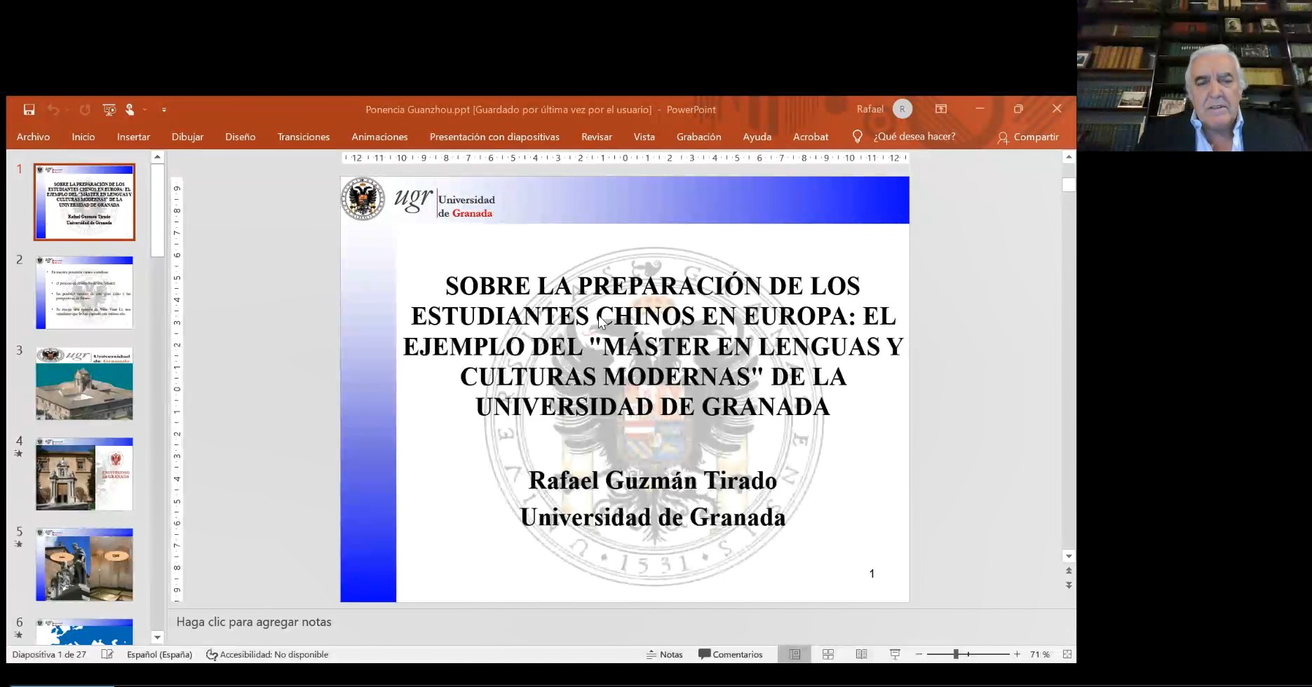 西班牙格拉纳达大学拉斐尔·古斯曼·蒂拉多(Rafael Guzmán Tirado)教授作了题为“中国学生在欧洲——以西班牙格拉纳达大学‘现代语言和文化’硕士项目为例”的主旨报告。古斯曼教授从西班牙格拉纳达大学的“现代语言和文化”硕士项目的发展过程出发,分析项目吸引中国学生的原因,指出,该项目横跨传统的语言教学领域和现代商业交流领域,对培养商业、法律、法医和技术-专业领域的语言和文化咨询人才,跨文化调解、出版和旅游专业人才具有一定的积极意义。