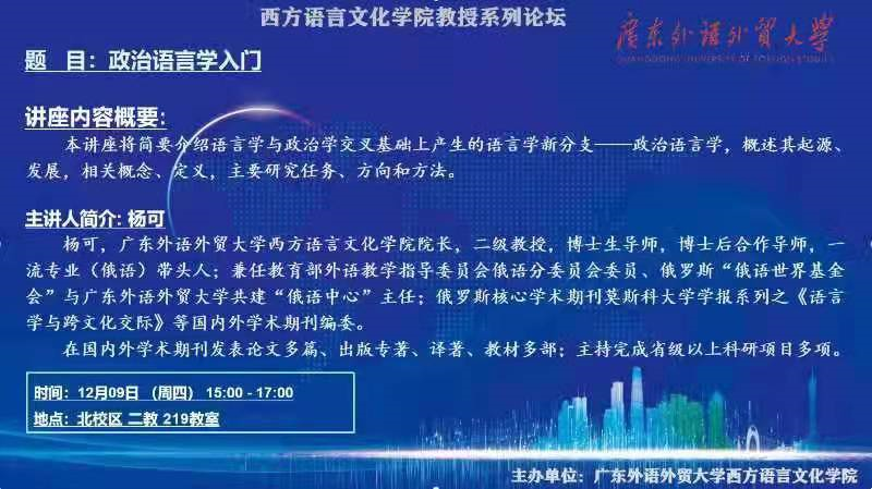 俄语系杨可教授带来题为《政治语言学入门》的专题讲座。讲座由研究生办公室主任臧宇主持,浪live