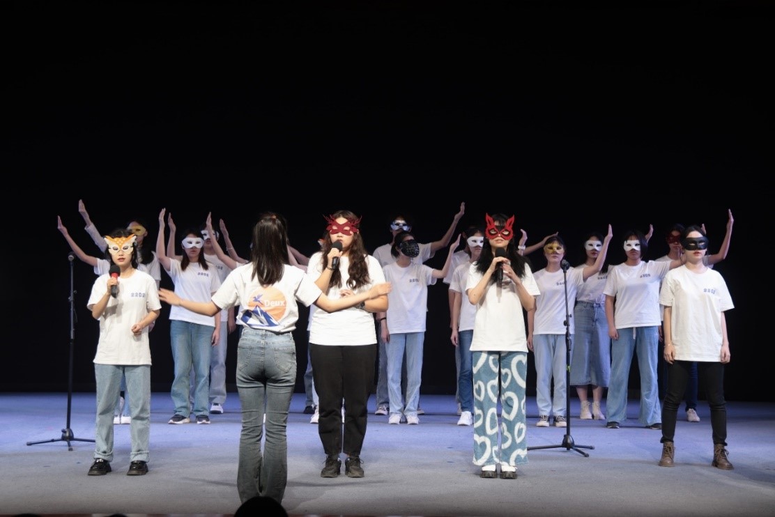 在第二篇章“续征程”中,西班牙语2101班和俄语2201班分别用歌曲《Someone in the crowd》和《For the first time in forever》鼓励大家敞开心扉、积极生活。来自不同专业的女生组合带来的舞蹈《Catch your attention》和塞尔维亚语2201班的舞蹈《Happy together》更是用热情灵动的舞姿牢牢吸引了全场观众的眼球。接下来,法语2202班的同学带着面具登场,以朗诵和合唱结合的形式发出了铿锵有力的声音:This is me!