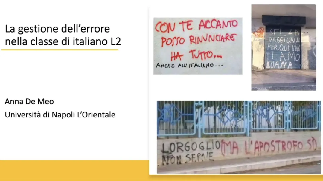首先,Anna De Meo 教授向同学们提出了两个问题:对你来说,在说意大利语时犯错意味着什么?你的老师纠正你的错误对你学习意大利语有多重要?同学们纷纷积极发表自己的看法。大多数同学表示,在学习意大利语的过程中犯错是不可避免的,我们应当正确地看待它,从中吸取经验;而老师的帮助是必不可少的。De Meo 教授肯定了同学们的发言,并深刻地阐述了何为“错误(errore)”以及它与“失误(sbaglio)”的区别:“错误(errore)”具有系统性,是按规则决定行为的标志,揭示了包括学习者能力的暂时的跨语言语言系统;而“失误(sbaglio)”则是随机的、短暂的,与疲惫或分心有关,即使是母语使用者也会犯下失误。人们可以自我纠正,也可以被引导纠正。