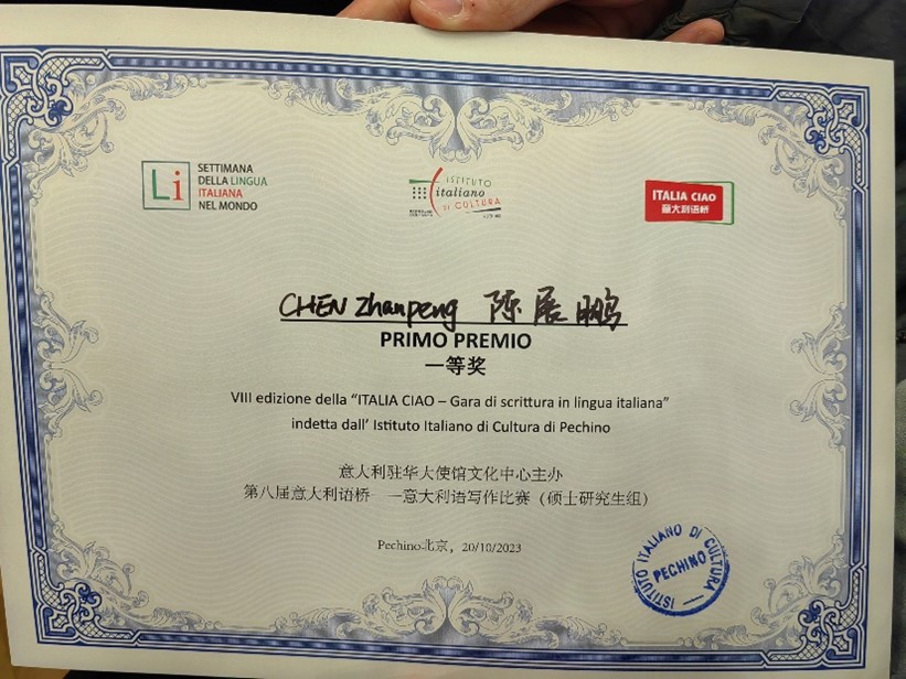 陈展鹏荣获意大利语写作比赛硕士研究生组一等奖