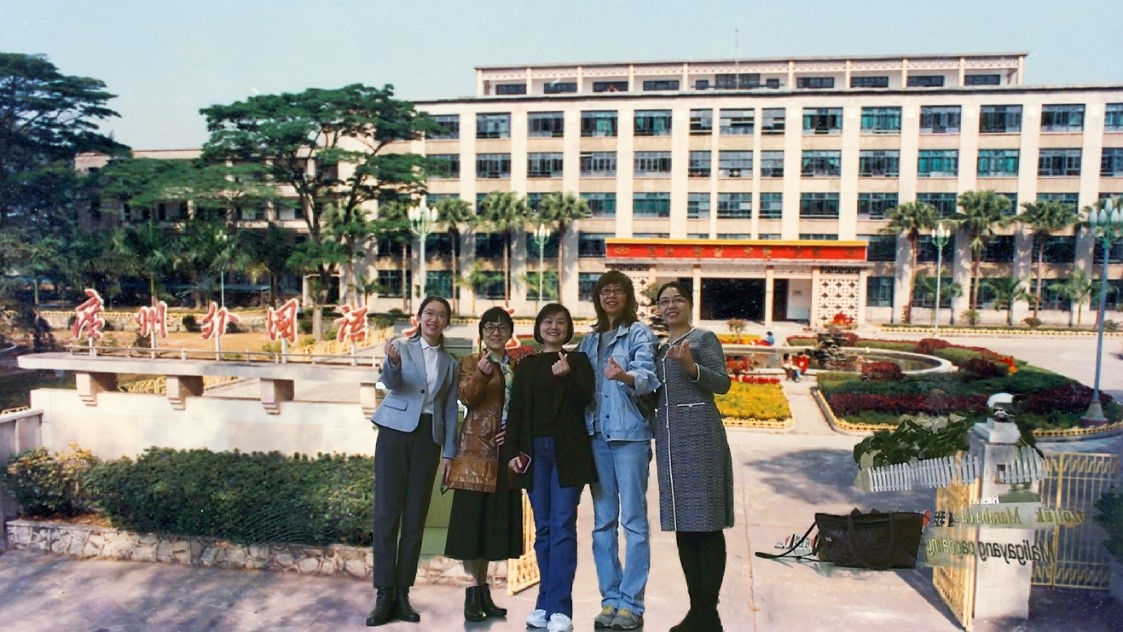 五级组织员敖湘晖、副书记魏少娟及西班牙语系教师秦晓莹、林婧等的陪同下,王珍一行到校史馆参观,回顾了广外的发展历程,畅谈当年温馨的校园生活,重温浓厚的师生情、广外情。尤其是翻看到当年的学生证照片和毕业合影时,王珍的同行团队成员马上玩起“看看谁先找出王珍总”的游戏,现场一片欢声笑语。王珍也为母校的巨大发展变化由衷点赞!