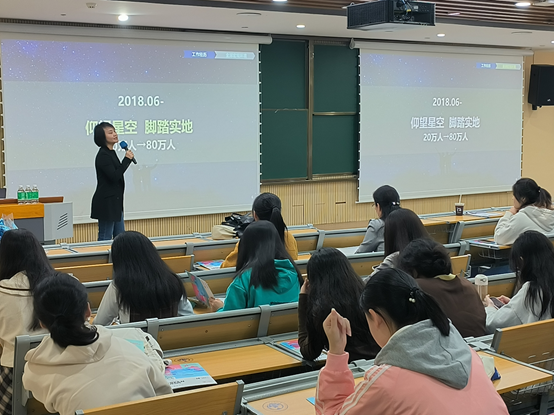 在北校区一教南楼109举办创新创业导师分享会,邀请学院创新创业导师,比亚迪集团人力资源处总经理王珍女士和同学们分享她在比亚迪一路走来的职场成长故事。分享会由浪live